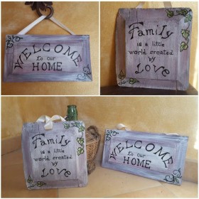 Targa artigianale stile shabby decorazione casa fuoriporta welcome legno personalizzatoTarghe in legno in stile shabby a scelta dipinte a mano...costo cadauna € 20.💜 😊😊 💜L'insegna in stile shabby "welcome" misura cm. 40x22.Targa "family is a little world creare by love" misura cm. 30x28.Sono dotate di nastro in raso per poterle appendere ovunque...