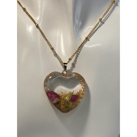 Ciondolo a cuore 3,5 cm in resina con boccioli di rose essiccate e foglie d'oro, catena dorata da 50 cm circa con palline alternate, saldate, placcatura sottovuoto, chiusura aragosta.