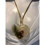Ciondolo a cuore 3,5 cm in resina con boccioli di rose essiccate e foglie d'oro, catena dorata da 50 cm circa con palline alternate, saldate, placcatura sottovuoto, chiusura aragosta.