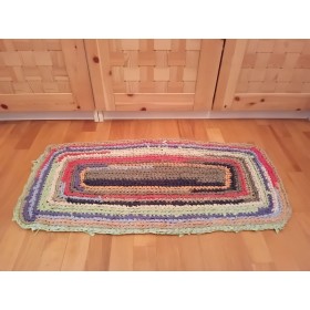 Tappetino realizzato lavorando all'uncinetto fettucce ricavate da vecchie magliette. Ideale per cucina o bagno. Lavabile in lavatrice. Pezzo unico. Dimensioni 83x45 cm